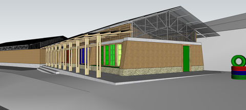 In 2019-2020, two of these temporary structures were demolished and replaced with rammed earth buildings. Stone from demolitions was reused and steel trusses altered and reinstalled in the new buildings.